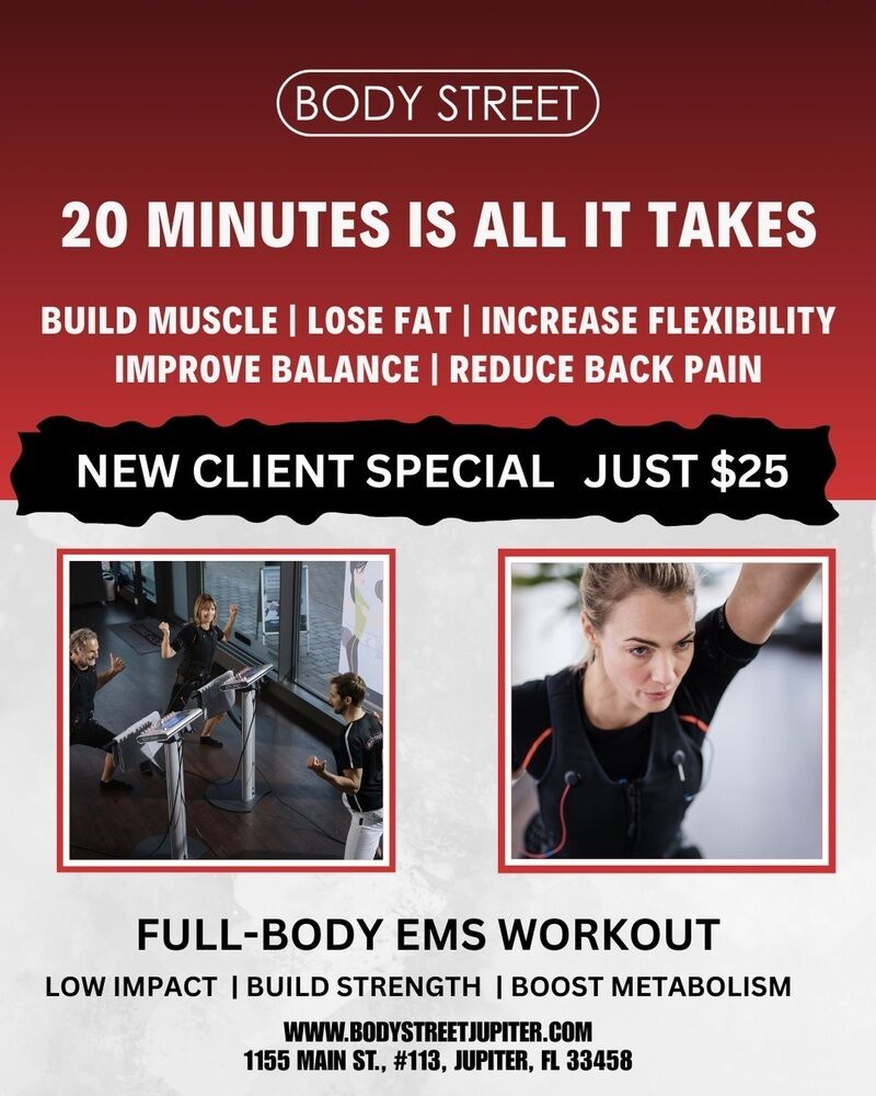 Discover the power of EMS training at Bodystreet in Jupiter, FL, where innovative 20-minute sessions activate up to 90% of your muscles for fast, efficient results. This boutique studio offers personalized coaching in a safe, joint-friendly environment-perfect for fitting effective workouts into your busy schedule. Experience a smarter, science-backed approach to building strength, toning, and overall wellness today.