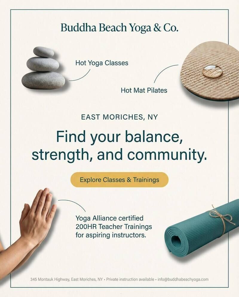 Discover the soothing ambiance of Buddha Beach Yoga in East Moriches, offering a variety of yoga styles including hatha, vinyasa, and hot yoga. With outdoor classes, private sessions, and community events, this welcoming studio creates a peaceful space to deepen your practice and connect with others.