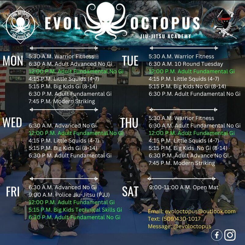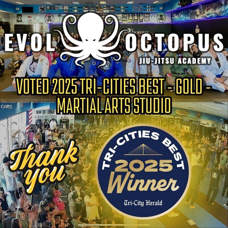 Discover Evol Octopus Jiu-Jitsu Academy in Kennewick, a premier martial arts school offering expert Brazilian Jiu-Jitsu, Muay Thai, and kickboxing classes for all ages. With a modern facility, dynamic group fitness options, and a welcoming atmosphere, it's the perfect place to boost your skills, fitness, and confidence.