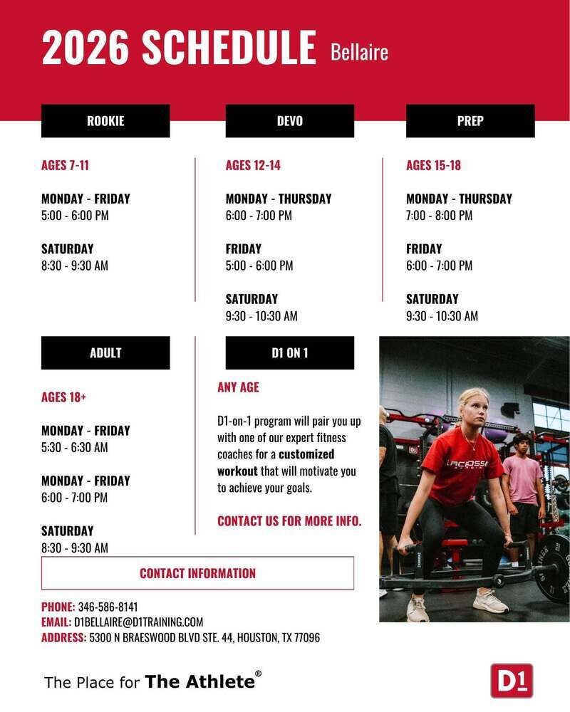 D1 Training - Bellaire. is located in Houston, United States. Train like an athlete at D1 Training Bellaire! Our certified coaches offer science backed workouts for youth and adults focused on strength, speed, and confidence. Join our Bellaire fitness community today! D1 Training Bellaire, Houston. 221 likes · 54 talking about this. D1 provides athletic-base.... Official website: https://d1training.com/facility/bellaire. Instagram: @D1Bellaire