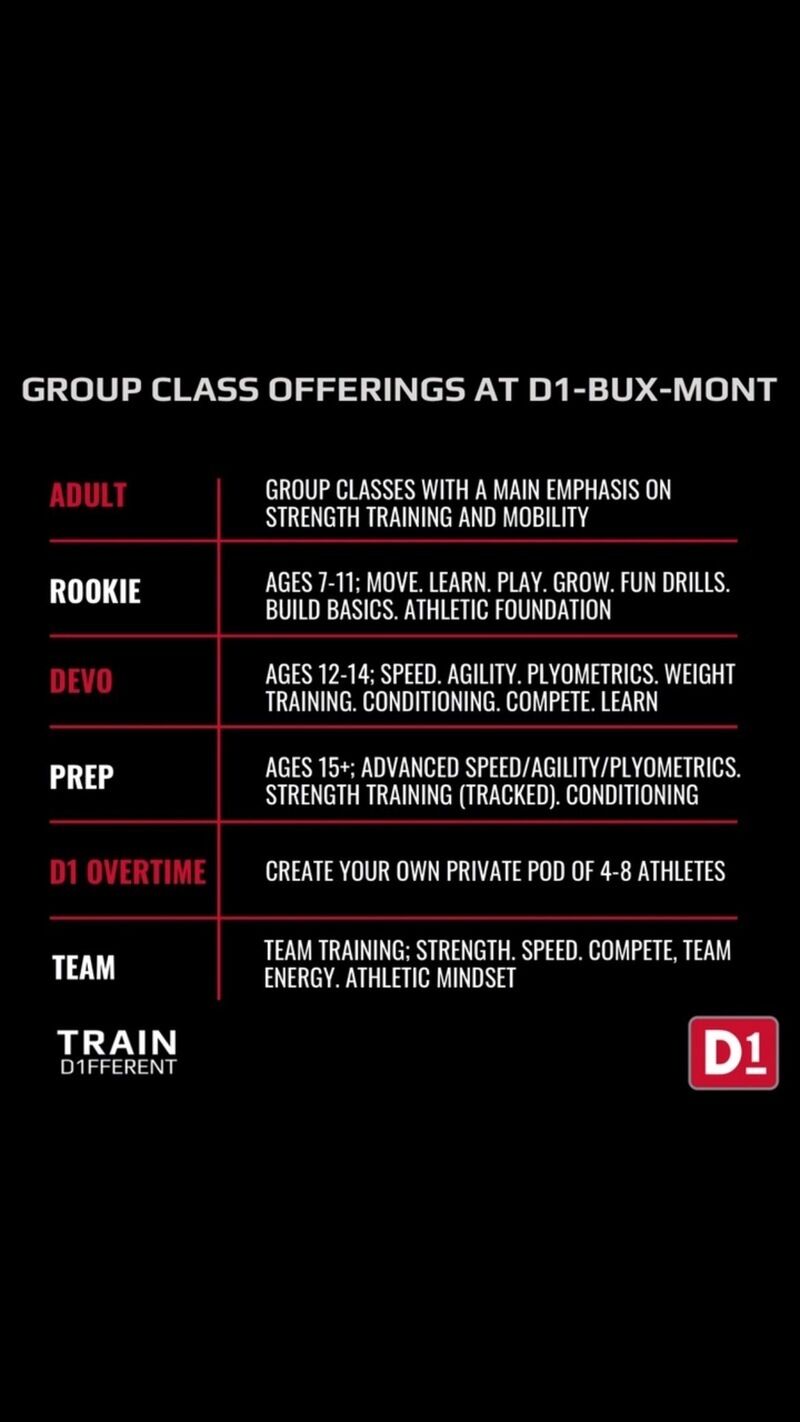 D1 Training - Bux-Mont, located in Colmar, PA, offers a comprehensive fitness and wellness experience based on Division 1 programming. The studio specializes in strength, conditioning, and agility training, providing tailored services for individuals and teams through group, one-on-one, and team training sessions designed for scholastic, teen, and adult athletes. With a focus on performance enhancement and overall health, D1 Training aims to elevate fitness levels and promote wellness in the community.